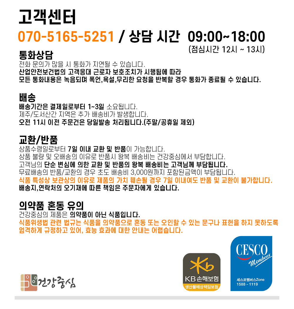 Copyright@2020 by 건강중심. All rights reserved. Hosting by makehomes | ![]() | 구매안전(에스크로) 서비스 | ![]() | 공정거래위원회 표준약관사용 | ![]() | SSL 결제 보안 인증 시스템 |