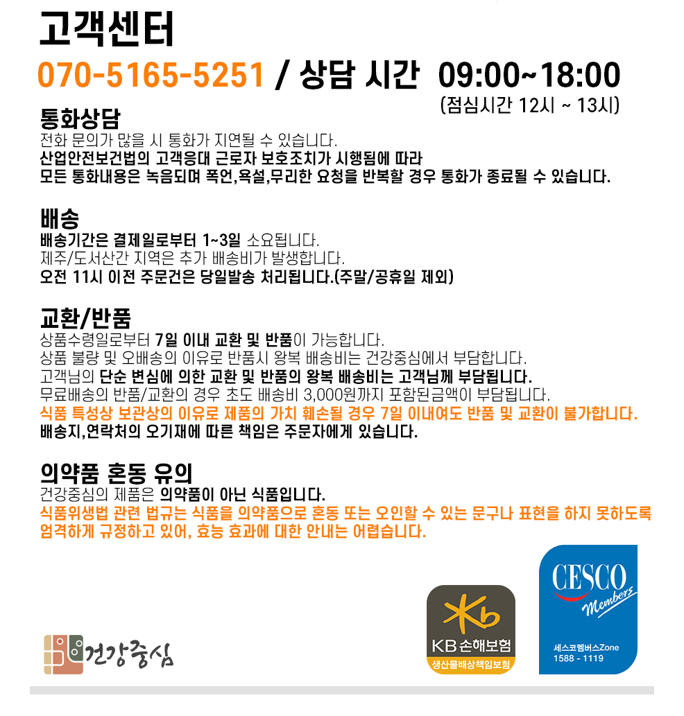Copyright@2020 by 건강중심. All rights reserved. Hosting by makehomes | ![]() | 구매안전(에스크로) 서비스 | ![]() | 공정거래위원회 표준약관사용 | ![]() | SSL 결제 보안 인증 시스템 |