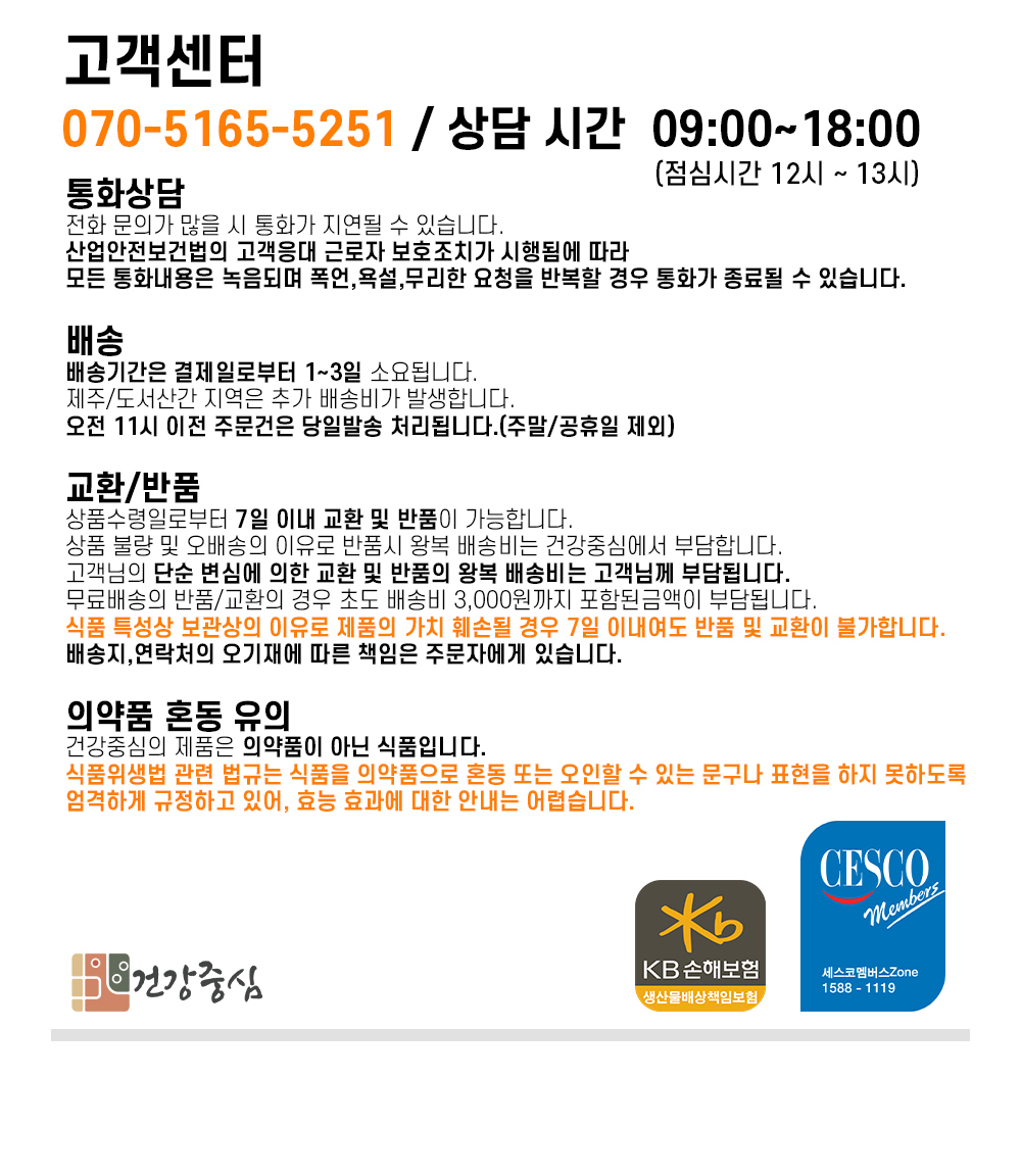 Copyright@2020 by 건강중심. All rights reserved. Hosting by makehomes | ![]() | 구매안전(에스크로) 서비스 | ![]() | 공정거래위원회 표준약관사용 | ![]() | SSL 결제 보안 인증 시스템 |